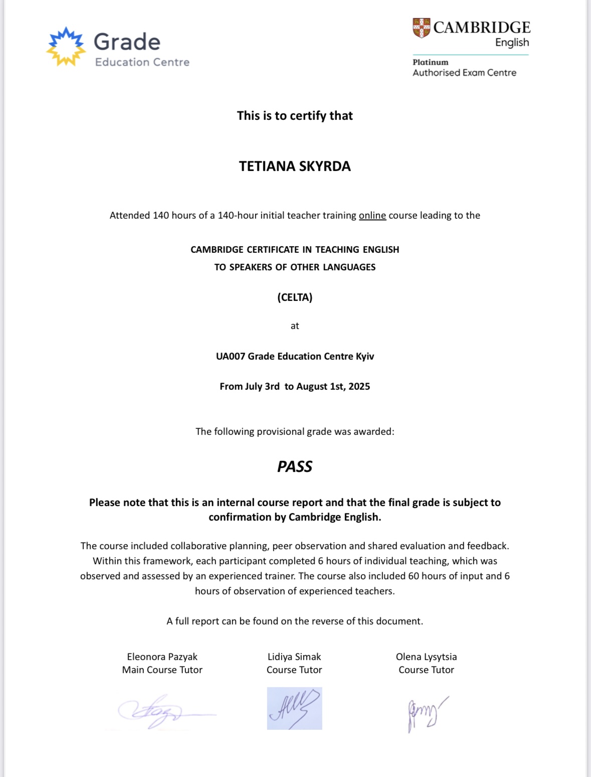 Світове визнання: в.о. завідувача кафедри іноземних мов та перекладу Тетяна Скирда отримала сертифікат CELTA!