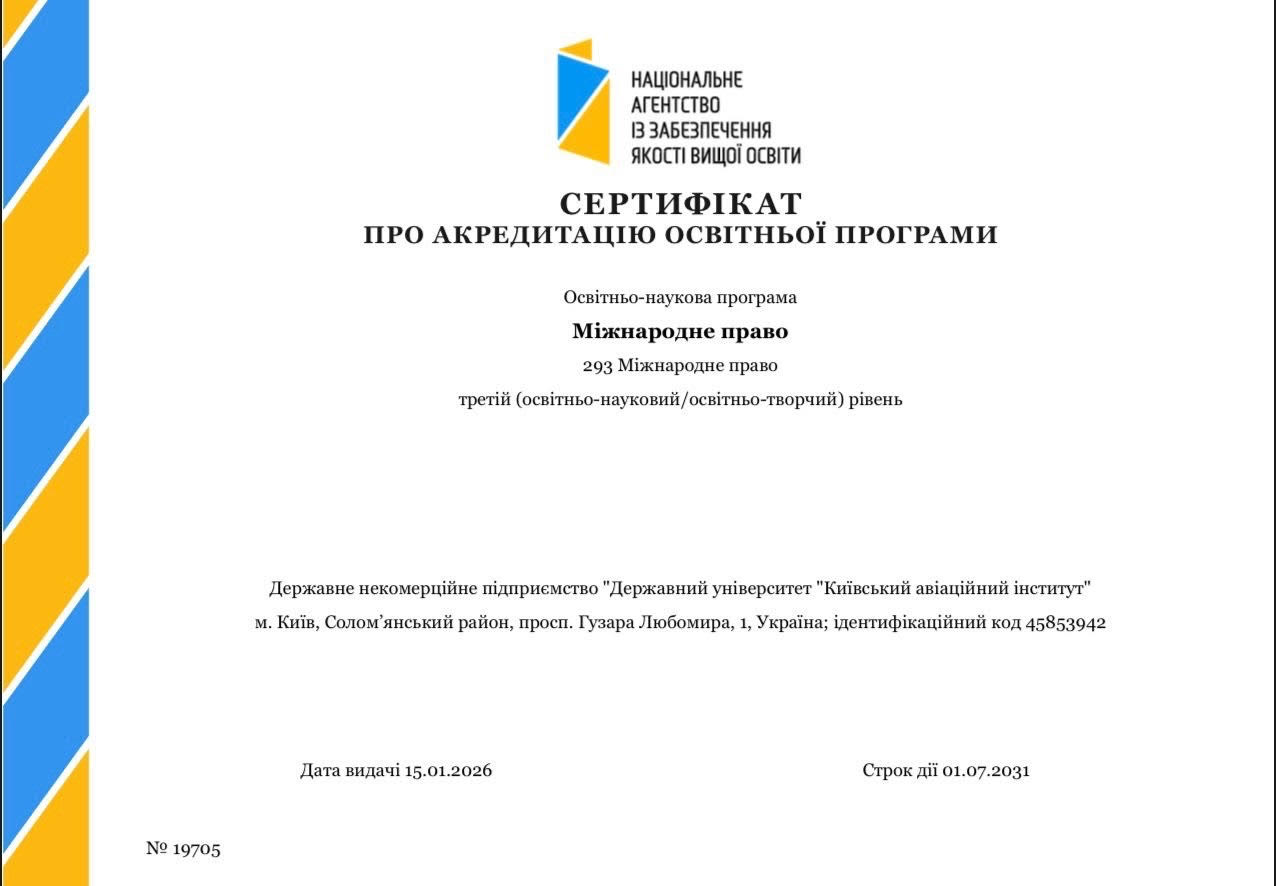 Отримано сертифікат про акредитацію ОНП «Міжнародне право» (PhD)
