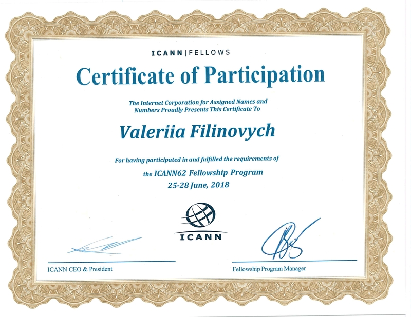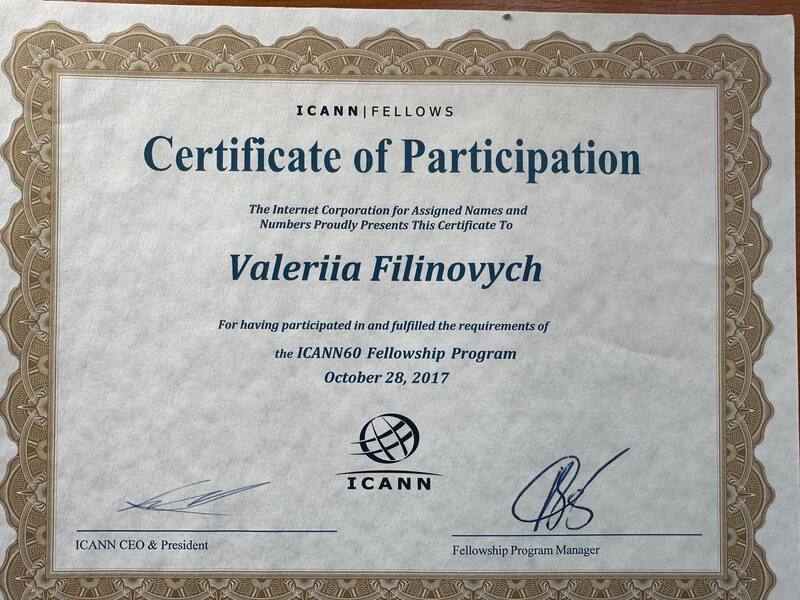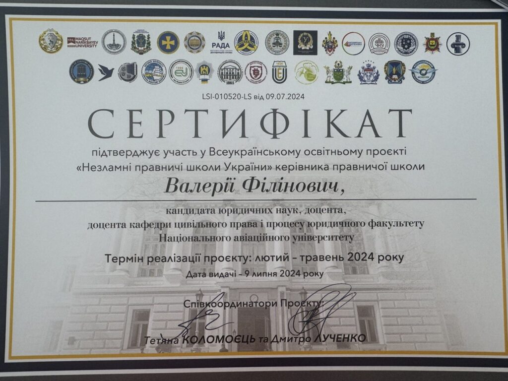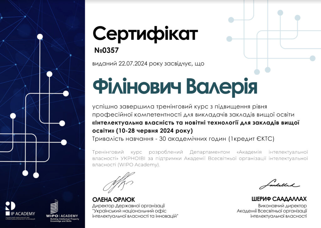 У 2025 року захистила докторську дисертацію по темі: “Забезпечення дотримання права інтелектуальної власності у кіберпросторі: світовий досвід та пропозиції для України“.