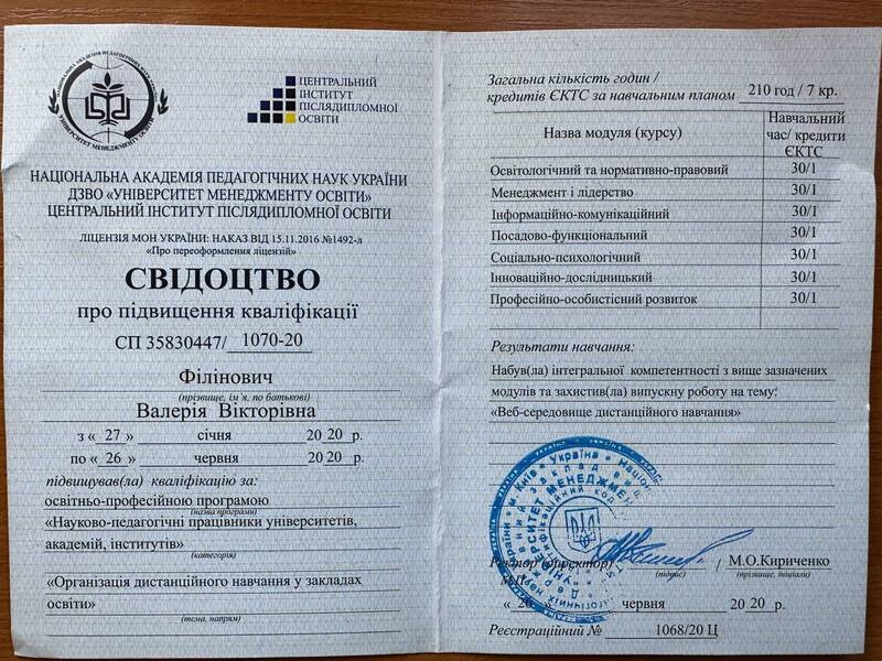 У 2020 р. пройшла підвищення кваліфікації ДЗВО «Університет менеджменту освіти» загальним обсягом 210 годин (7 кредитів), тема випускної роботи: «Веб-середовище дистанційного навчання».