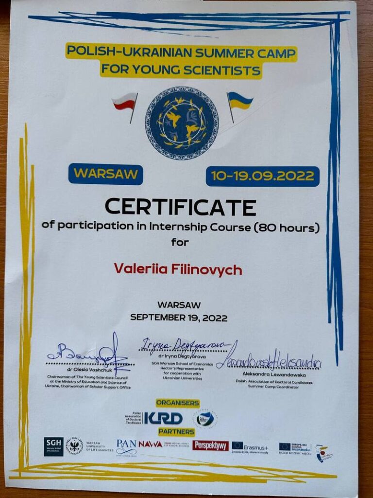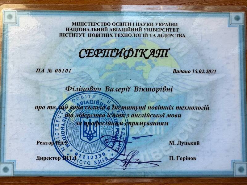 У 2021 році вступила до докторантури денної форми навчання Національного авіаційного університету (за державним замовленням).