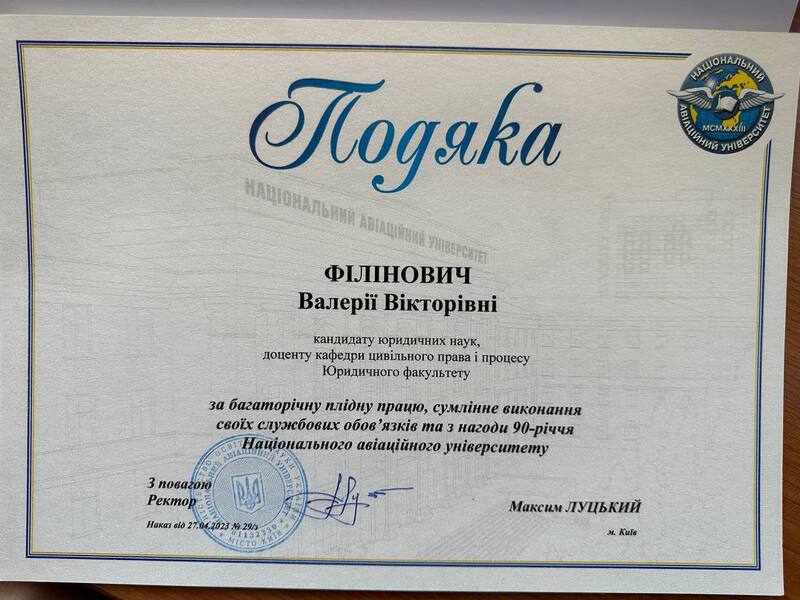 За сумлінне виконання своїх службових обов’язків Філінович В.В. нагороджена грамотою НАУ (наказ №69/з від 14.05.2021) та Подякою ректора НАУ (наказ №29/з від 27.04.2023).