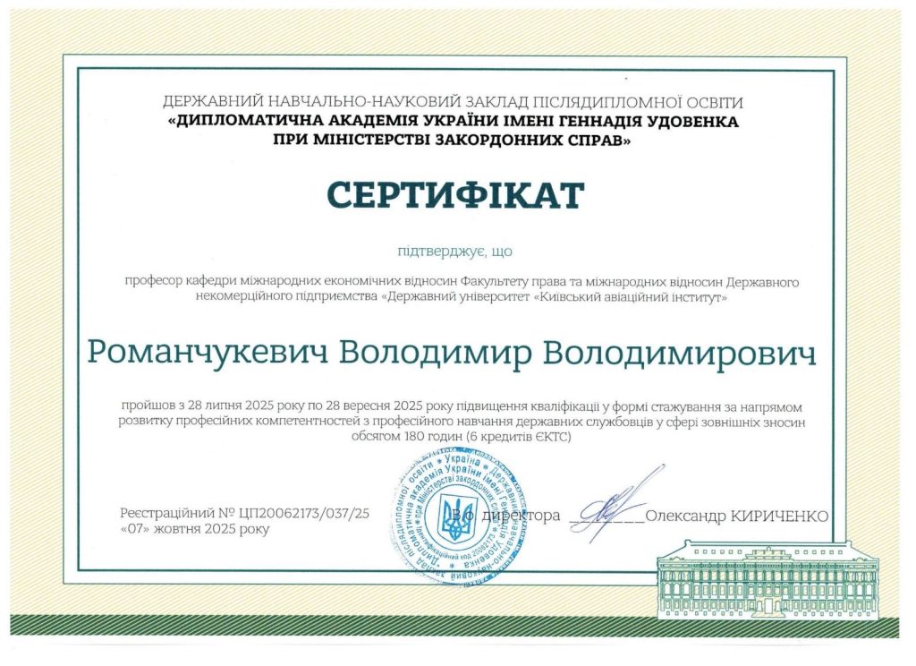 2023 – теперішній час – професор кафедри міжнародних економічних відносин факультету права та міжнародних відносин КАІ