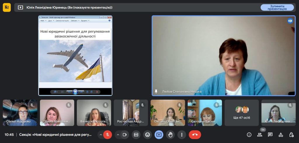 Відкриваючи захід, в.о. декана Юридичного факультету, кандидат юридичних наук, доцент Валерія Філінович вітаючи учасників, зазначила: «Стрімкий розвиток технологій в авіації та космосі відкриває перед нами нові горизонти, але водночас ставить перед суспільством чимало юридичних викликів. Зокрема, вбачається потреба в оновленні правової бази щодо використання повітряного простору, запуску нових комерційних проектів в космосі, захисту прав людини в даній галузі та, безумовно, безпеки польотів».