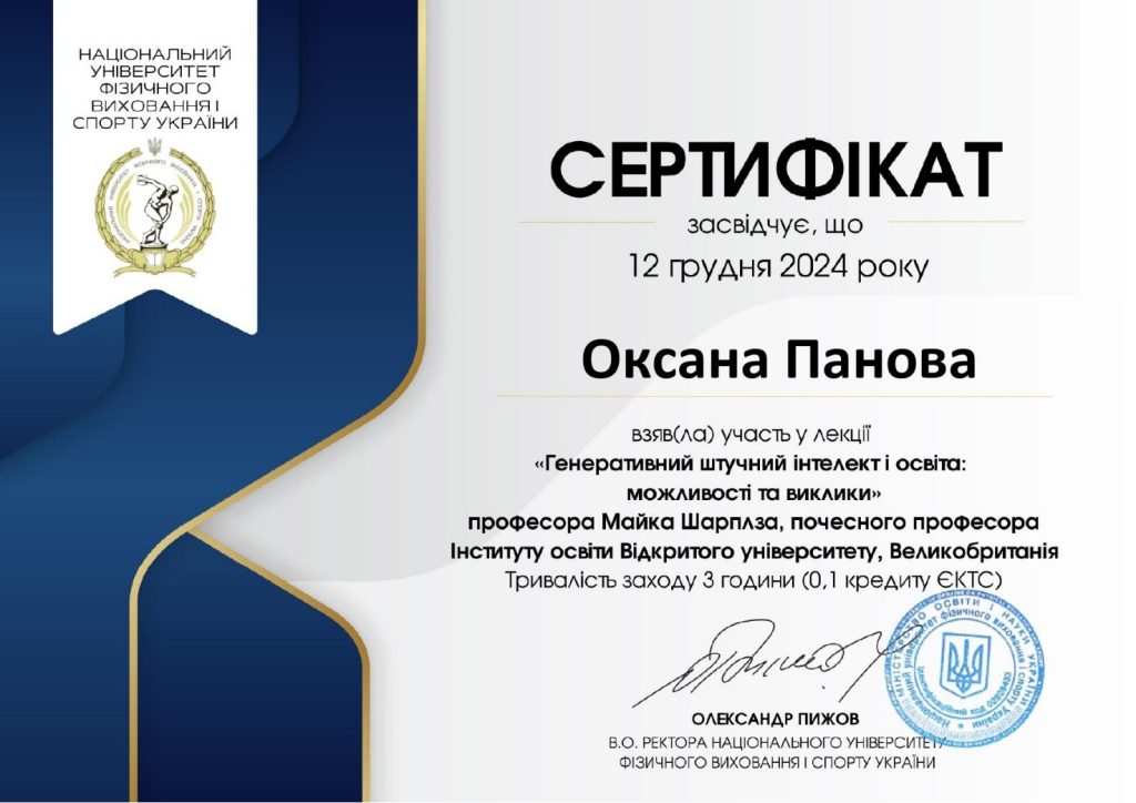 10 та 12 грудня 2024 року професорка кафедри кримінального права і процесу Юридичного факультету, д.ю.н., професорка Оксана Панова відвідала серію заходів з інтеграції штучного інтелекту в освіту, які проведено на базі Національного університету фізичного виховання і спорту України.