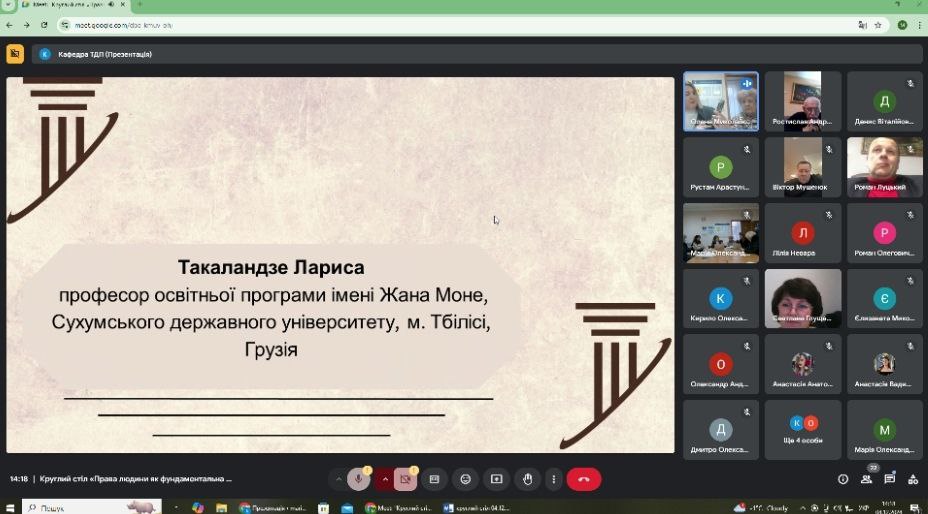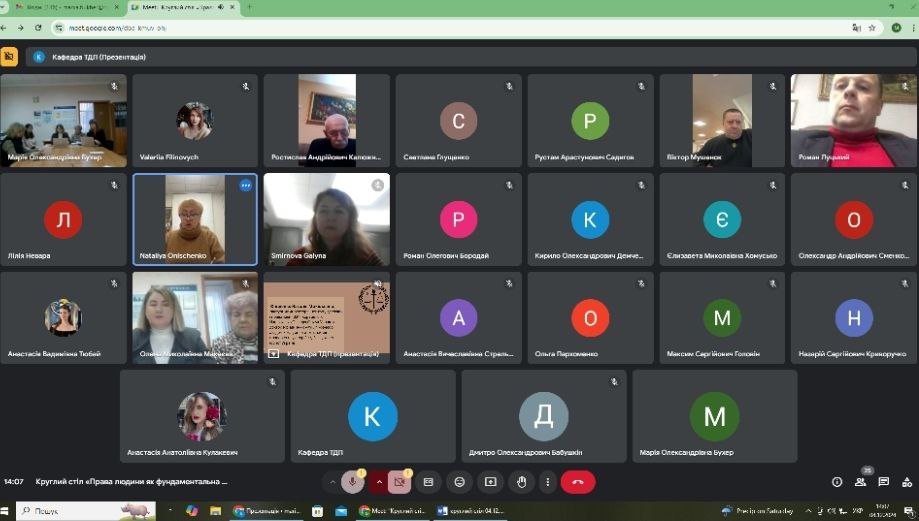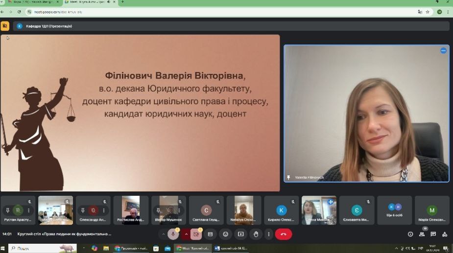 4 грудня 2024 року кафедрою теорії та історії держави і права спільно з Інформаційно-просвітницьким центром з прав людини Юридичного факультету у змішаному форматі проведено науково-практичний круглий стіл із міжнародною участю на тему «Права людини як фундаментальна цінність демократичного суспільства в умовах євроінтеграції».