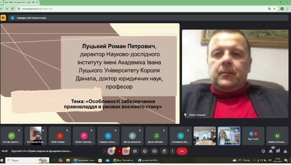 – директор Науково-дослідного інституту імені Академіка Івана Луцького Університету Короля Данила, доктор юридичних наук, професор Роман Луцький на тему «Особливості забезпечення правовладдя в умовах воєнного стану»;