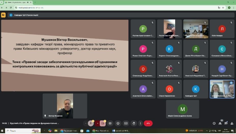 – завідувач кафедри теорії права, міжнародного права та приватного права Київського міжнародного університету, доктор юридичних наук, професор Віктор Мушенок на тему «Правові засади забезпечення громадськими обʼєднаннями контрольних повноважень за діяльністю публічної адміністрації»;