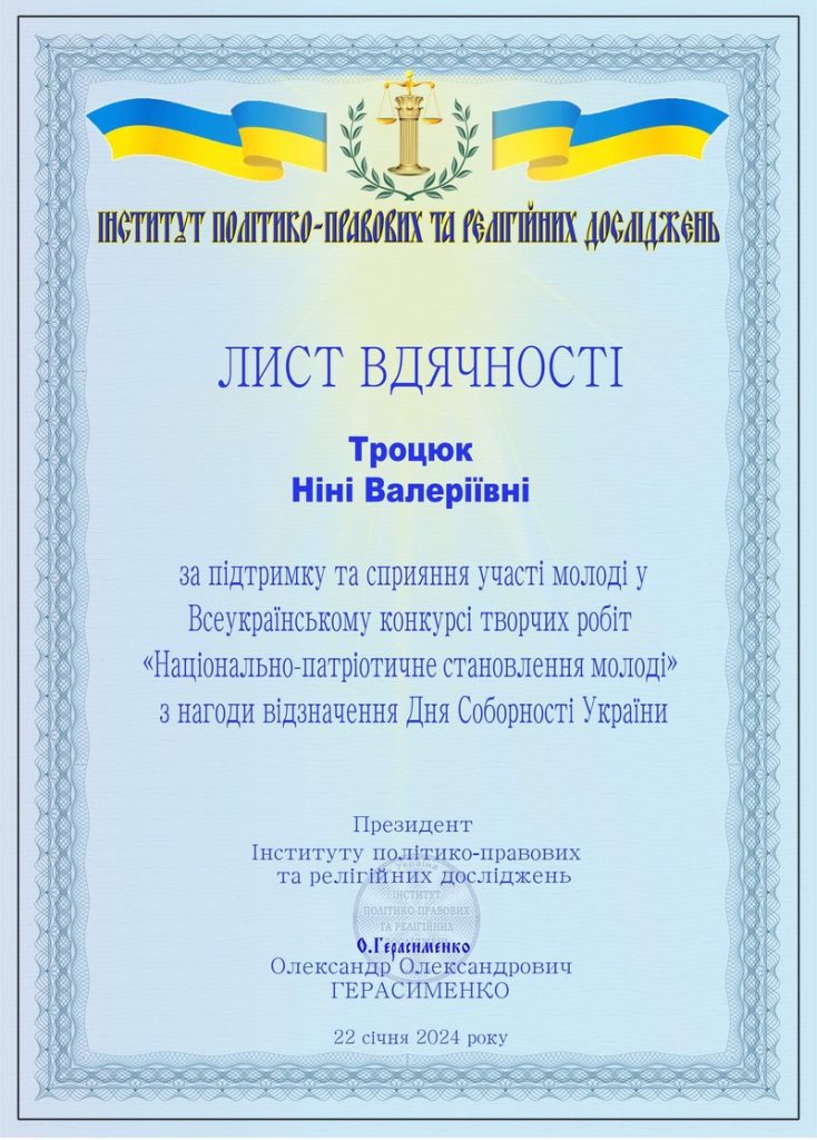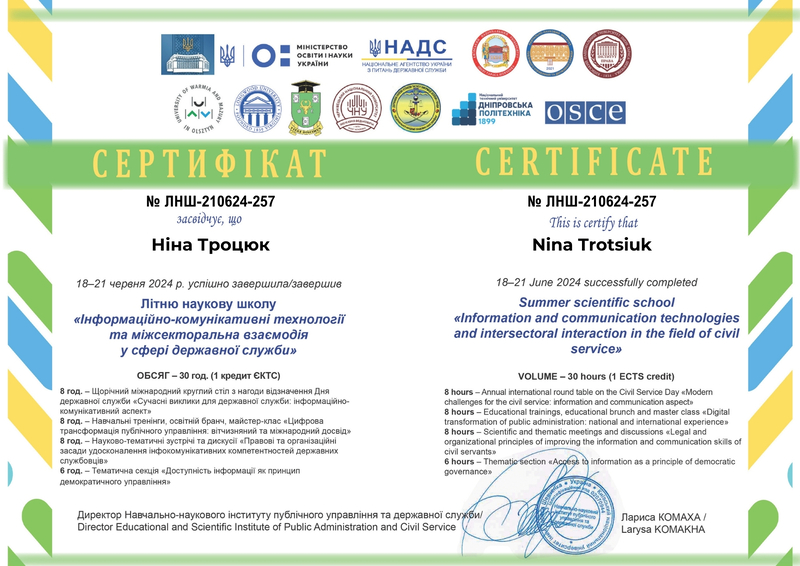 У червні 2021 року пройшла закордонне стажування за напрямом “European science and internationa communication (law, economics, psychology, public administration, Information technology)” / «Європейська наука та міжнародні комунікації (право, економіка, психологія, державне управління, інформаційні технології)» у Варшавському університеті.