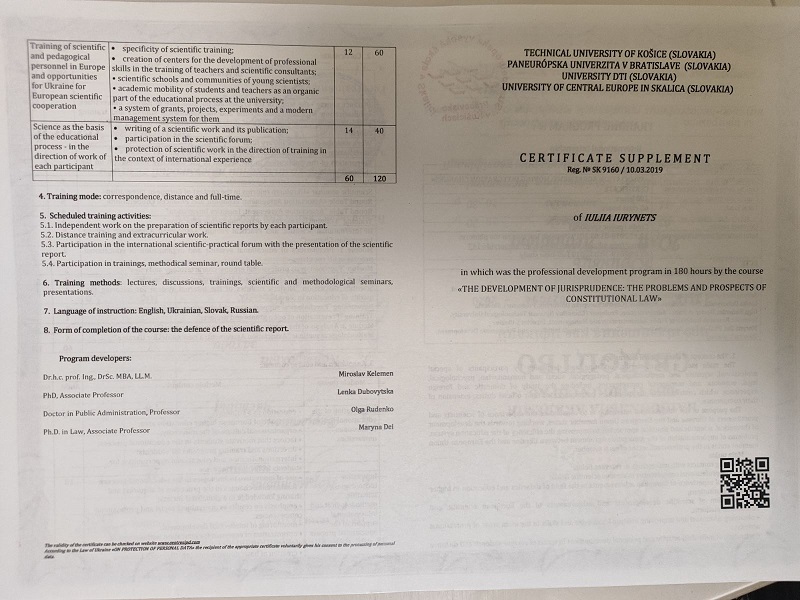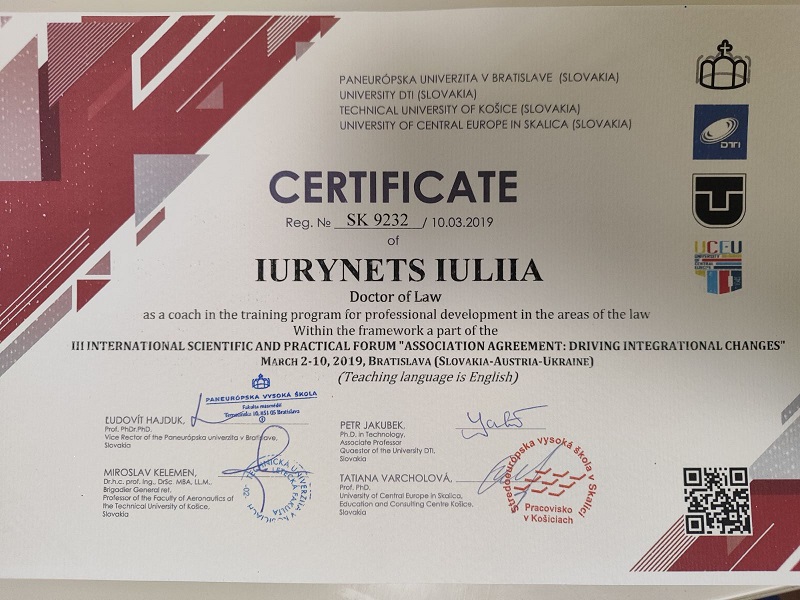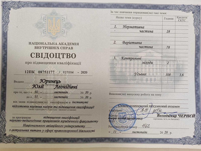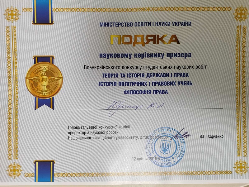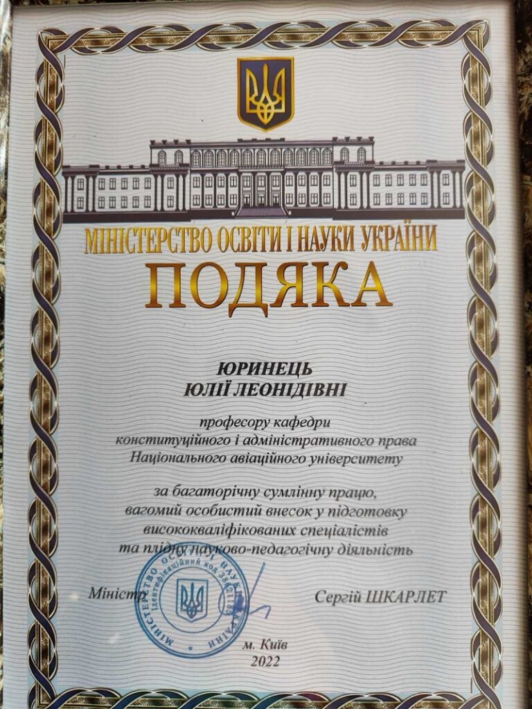 У 2019 р. присвоєно вчене звання професора кафедри конституційного і адміністративного права.